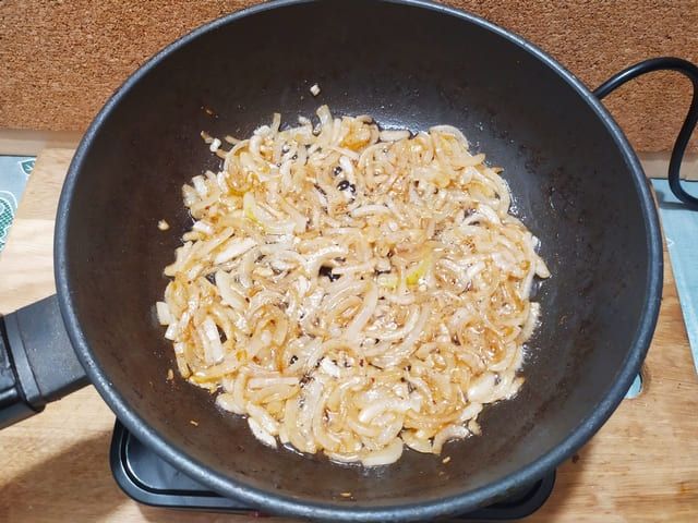 В сковороду выкладываем нарезанный брусочками или четвертинками колец лук и обжариваем до мягкого состояния.
