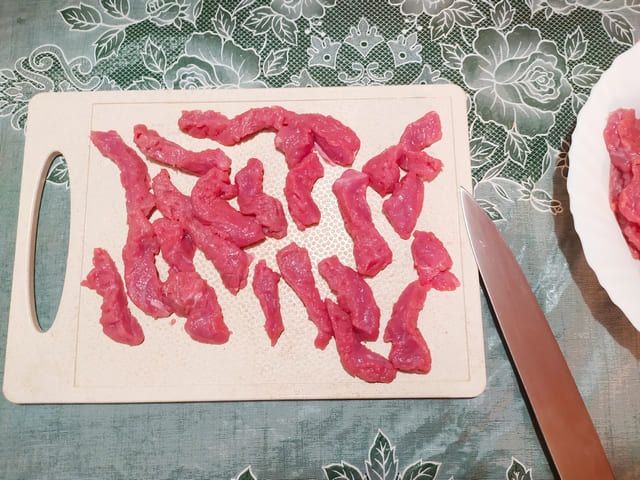 Далее режем говядину тонкими пластинками или кубиками. Слишком толсто нарезать не нужно, иначе мясо придется долго тушить.