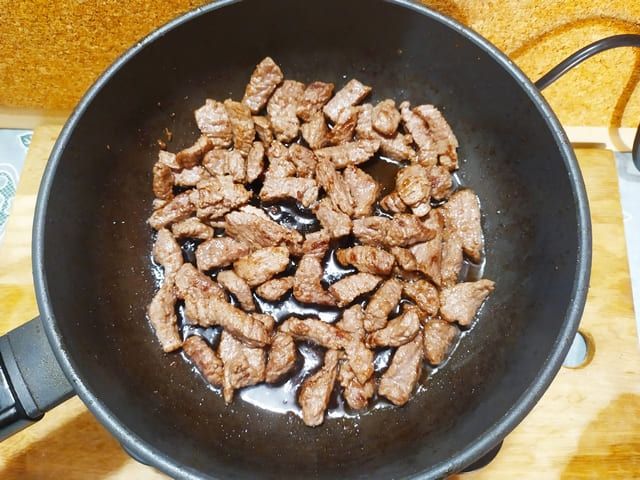 Разогреваем сковороду с растительным маслом и быстро обжариваем говядину до легкого золотистого цвета. Если вы готовите много мяса, обжаривайте его порционно, чтобы оно не тушилось в собственном соку, а слегка поджаривалось.