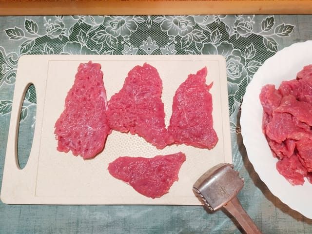 Нарезаем мясо поперек волокон и слегка отбиваем молоточком (как на отбивные).