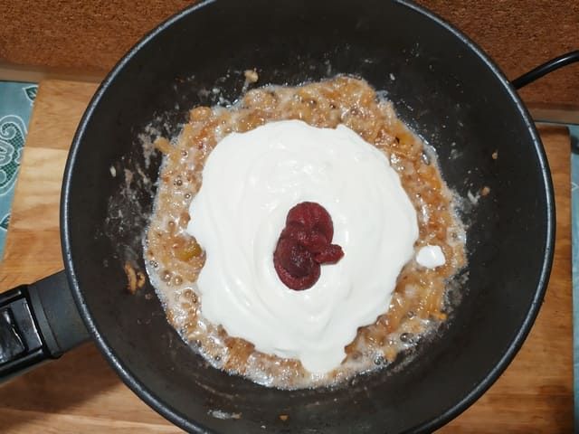 Добавить сметану и томатную пасту.