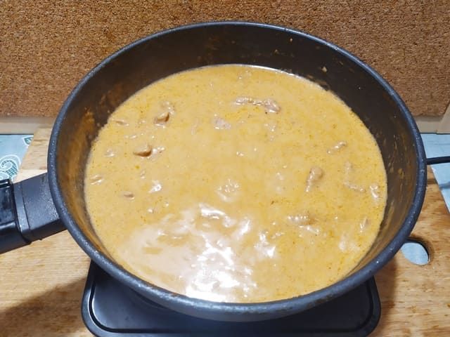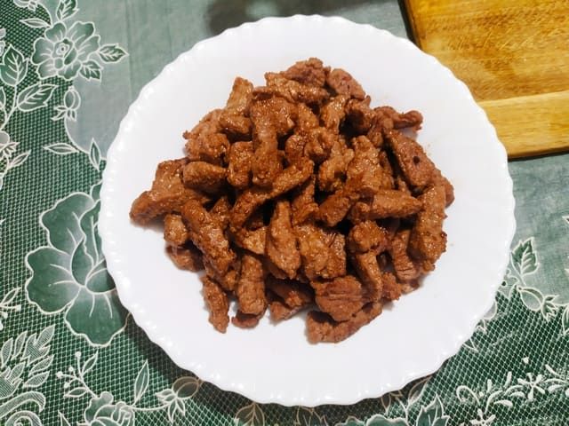 Тушится мясо на слабеньком огне от 15 минут до 1.5 часов в зависимости от качества говядины. Соус получается довольно вязким, поэтому каждые 10 минут его нужно перемешивать. Также по мере выкипания влаги, в него нужно подливать небольшое количество воды. В этом случае соус не подгорит, а мясо успеет нормально протушиться. -