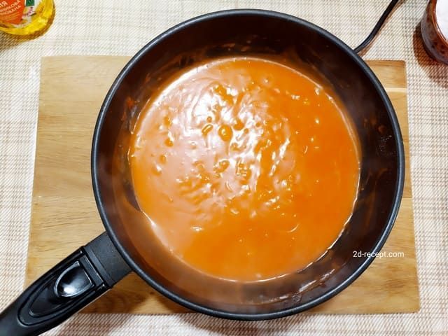 Когда лук станет мягким, добавляем томатную пасту, вливаем воду (около 2/3 стакана) и перемешиваем соус. Засыпаем в соус соль и сахар. Тушим подливку, пока она не загустеет.