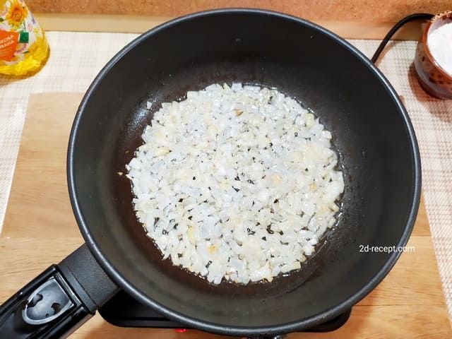 На отдельной сковороде обжариваем лук до золотистого оттенка. Добавляем к нему морковь и жарим все вместе.