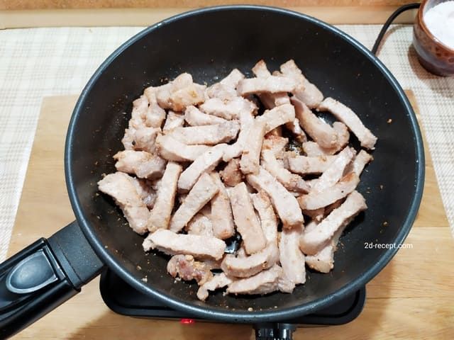 Разогреваем сковороду с растительным маслом и обжариваем мясо, пока не испарится лишняя влага. Слегка подсаливаем и перчим. Жарим мясо до тех пор, пока оно не приобретет легкий золотистый оттенок.
