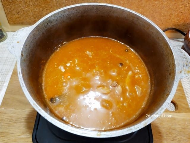 Отправляем подливку в сковороду к мясу, забрасываем лавровый лист и перец. При необходимости заливаем еще немножко воды, чтобы покрыть мясо.