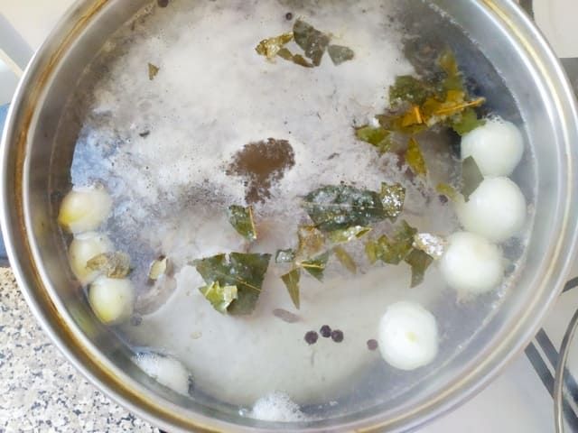 Когда вода повторно закипит, забрасываем лук, лавровый лист и перец. Если лук крупный, его можно разрезать на 2-4 части. Вливаем соевый соус, при необходимости досаливаем бульон. По желанию соус можно не добавлять, а просто сильнее подсолить воду.