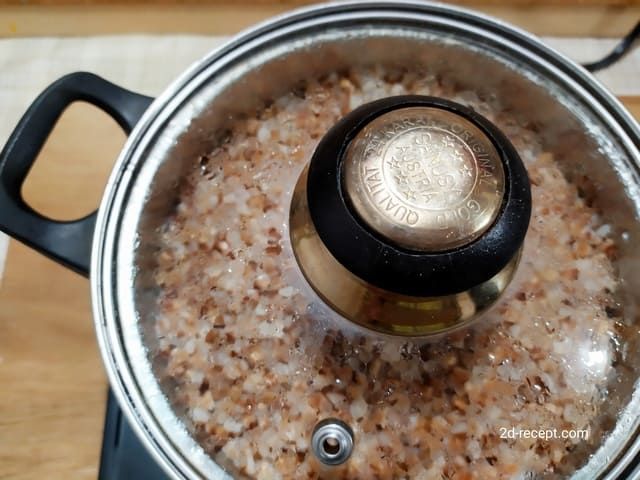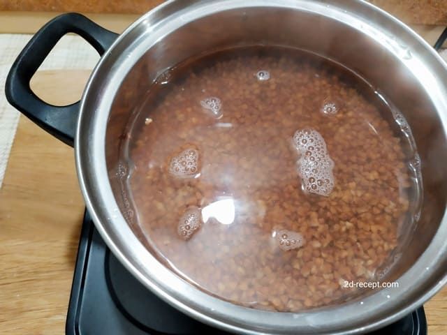 Заливаем гречку водой из расчета 2 стакана воды на 1 стакан гречки. Если будем варить гречку в кастрюле без крышки, добавим еще немножко воды с учетом выкипания (около 1/5 стакана). Ставим кастрюлю на плиту и доводим до кипения.