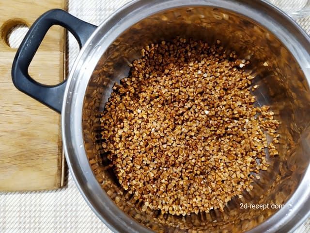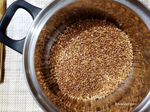 Берем небольшую кастрюлю, высыпаем в нее гречневую крупу. Промываем водопроводной водой, чтобы убрать пыль и остатки мусора. Тщательно сливаем остатки жидкости, придерживая крупу руками или используя сито.
