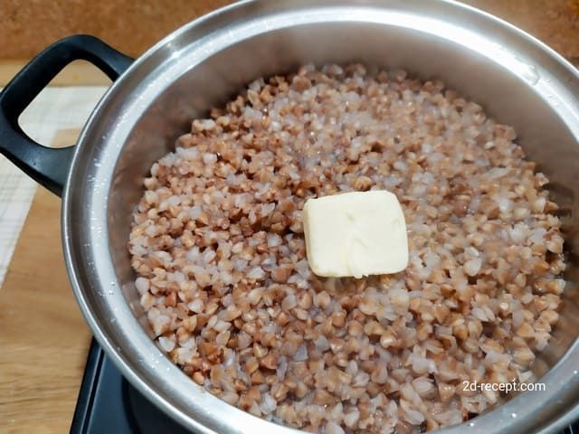Когда почти вся вода впиталась, выключаем плиту и добавляем в гречку сливочное масло. Если гречка кажется влажной, не страшно, она постоит и впитает остатки жидкости. -