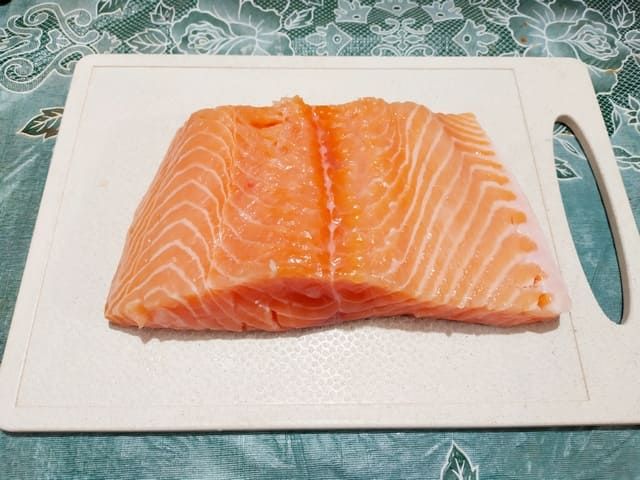 Засолить этим способом можно любую красную рыбу, например, лосось, сёмгу, форель, горбушу. Мы же сегодня взяли филе лосося массой 500 г. Удалять шкуру с рыбы не следует, достаточно очистить филе от чешуи и крупных костей, если таковые имеются.