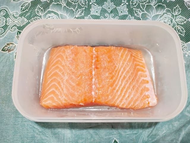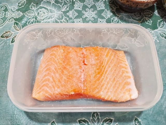 Прикрываем контейнер крышкой или пищевой пленкой и убираем в холодильник на 12 часов. Через 12 часов лосось получается малосольным. Если любите более соленую рыбу, переверните кусок другой стороной и оставьте в образовавшемся рассоле еще на 1-2 часа в холодильнике.