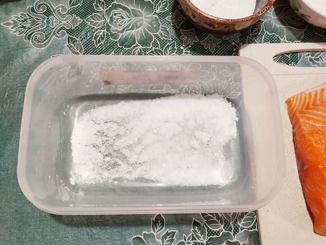 Обвалять лосось в соле и сахаре.
