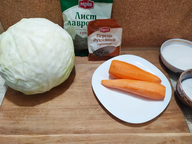Для приготовления квашеной капусты нам потребуется вилок капусты около 2 кг, пару крупных морковок, соль, сахар и специи. Капусту нужно выбирать белую, зеленая молодая капуста нам не подойдет.