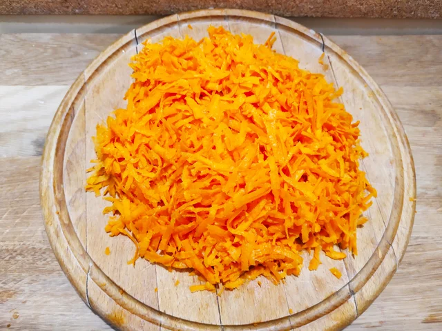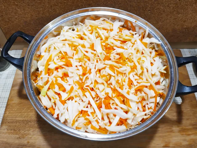 Смешиваем морковь и капусту и слегка сминаем их руками, тогда они быстрее пустят сок.