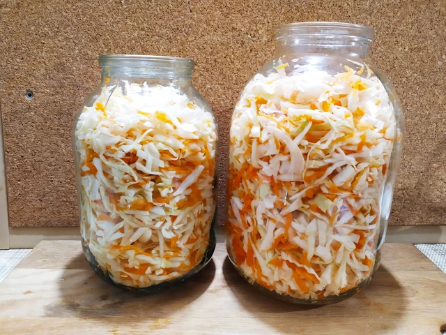 Складываем капусту с морковью в банки, по возможности поплотнее трамбуем.