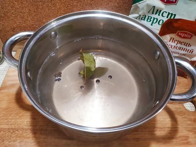 В кастрюлю наливаем 2,5 литра воды и ставим на огонь. Добавляем 4 ст. ложки соли (без горки), 2 ст. ложки сахара, лавровый лист и душистый перец. Доводим до кипения и снимаем рассол для квашеной капусты с огня. Оставляем остывать.