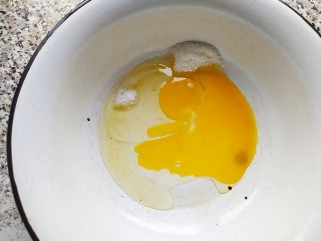 Готовим тесто для пирога. Разбиваем яйцо, добавляем растительное масло, соль и сахар.