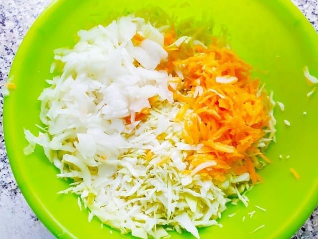 Готовим начинку. Шинкуем капусту, а морковь трем на терке. Лук режем брусочками. Смешиваем овощи и разминаем руками. Добавляем сахар и соль по вкусу, а также засыпаем немножко лимонной кислоты.
