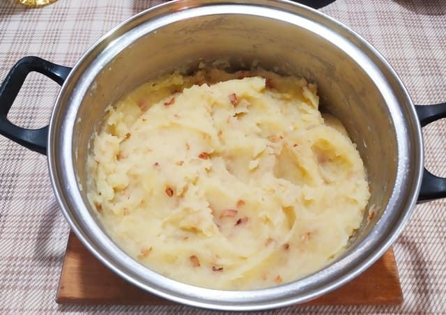 С отваренного картофеля сливаем воду в отдельную посуду. Разминаем в пюре, постепенно добавляя воду, в которой варилась картошка. Сюда же засыпаем обжаренный лук. Можно также добавить немножко сливочного масла. Тщательно смешиваем, при необходимости добавляем соль и молотый перец по своему вкусу.