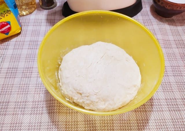 Замешиваем тесто для вареников с картошкой, подсыпая муку. Муки обычно уходит около 3-3,5 стаканов. Ее количество лучше корректировать таким образом, чтобы тесто получилось не слишком тугим, но и не прилипало к рукам. После замешивания тесту лучше дать постоять не менее получаса.
