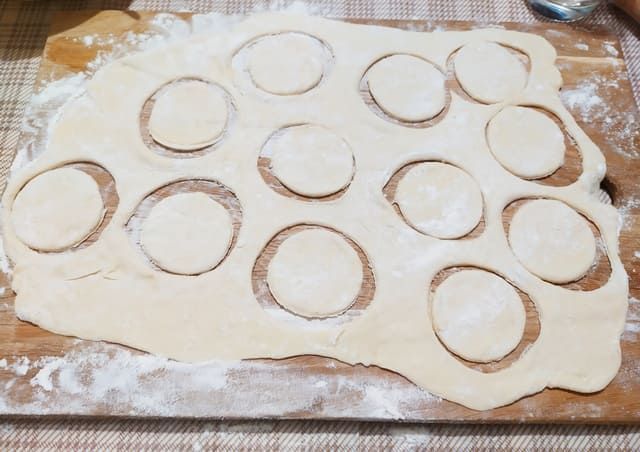 Если первый вариант для вас не очень удобный, можете раскатать тесто листом с толщиной около 2 мм и при помощи небольшого стакана вырезать кружочки. В каждый кружочек нужно сложить начинку и залепить края. Готовые вареники нужно сложить на разделочную доску, тарелку или противень. Чтобы они не прилипали, поверхность сразу следует посыпать небольшим количеством муки. На этом вареники с картошкой готовы. Их можно оставить в морозильной камере или сразу отварить и есть.
