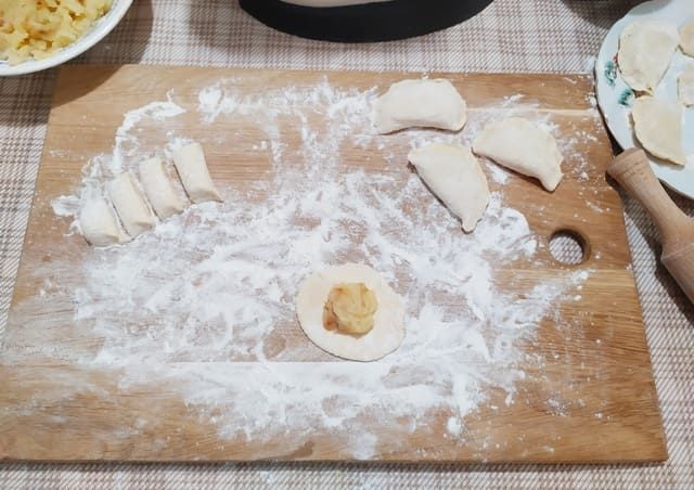 Когда начинка и тесто готовы, можно приступать к лепке вареников. Для этого тесто лучше разделить на части, раскатать в ролы и порезать кружочками. Каждый кусочек можно размять в руке или при помощи скалки, положить в него начинку, сложить пополам и защепить края.