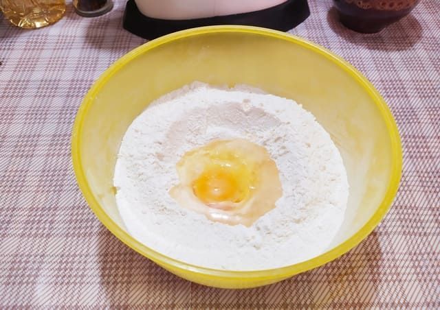 Тесто для вареников по этому рецепту готовится очень быстро и легко. Для этого берем глубокую миску и всыпаем в нее часть муки и соль. Добавляем сырое яйцо, растительное масло и воду.