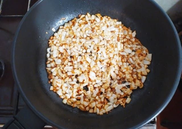 Перед тем как приступить к лепке вареников, необходимо предварительно подготовить начинку. Для этого ставим вариться картошку в подсоленной воде, параллельно режем лук мелкими кубиками и обжариваем на сковороде на растительном масле.