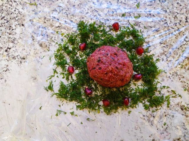 Мокрыми руками формируем шарик из закуски и обваливаем в укропе. По желанию украшаем гранатом. Удобнее всего обваливать закуску при помощи пищевой пленки, поочередно приподнимая ее края. В этом случае зелень будет налипать на закуску, а не на руки.