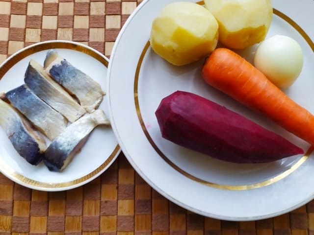 Для приготовления первой закуски необходимо предварительно отварить и очистить свеклу, картофель в мундире и морковь. Также нам потребуется филе сельди без костей.