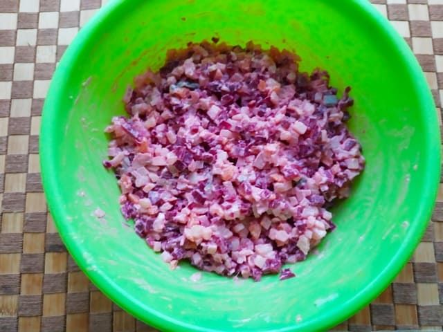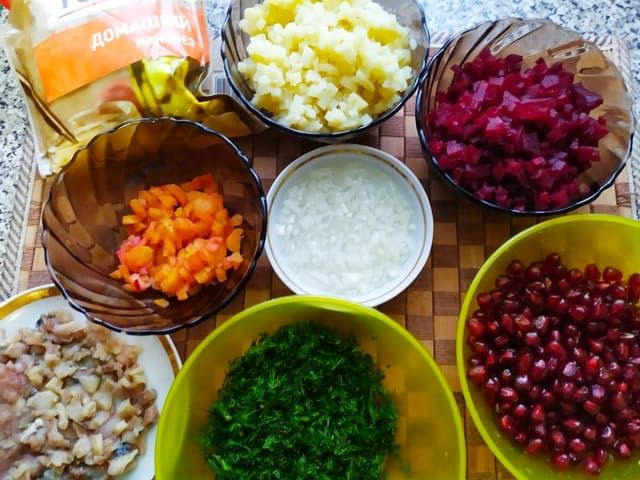 Мелко нарезаем свеклу, морковь, селедку и картошку. Лук маринуем в воде с небольшим количеством уксуса. Укроп рубим ножом.