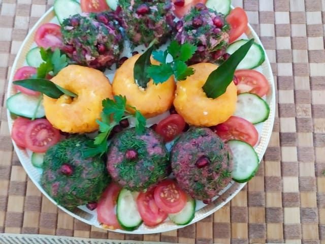 Соединяем картофель, свеклу, морковь и лук. Добавляем селедку и заправляем салат майонезом. При необходимости подсаливаем. Мокрыми руками формируем шарики и обваливаем их в зелени. По желанию добавляем зерна граната.